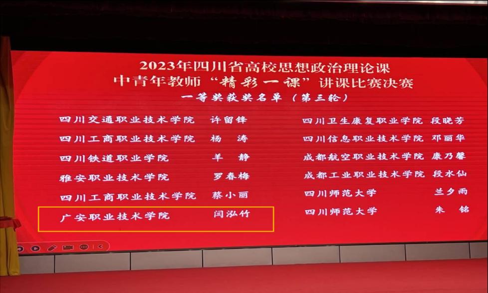 10月28日-29日,由四川省委教育工委、教育厅主办的四川省高校思想政治理论课中青年教师“精彩一课”教学比赛决赛在四川师范大学举行。本次比赛全省共有107所高校447名教师参加复赛,经专家评审,共有56所高校136名教师入围决赛。经过激烈角逐,澳门网投官网澳门网投官方网站选派的闫泓竹老师脱颖而出荣获一等奖。